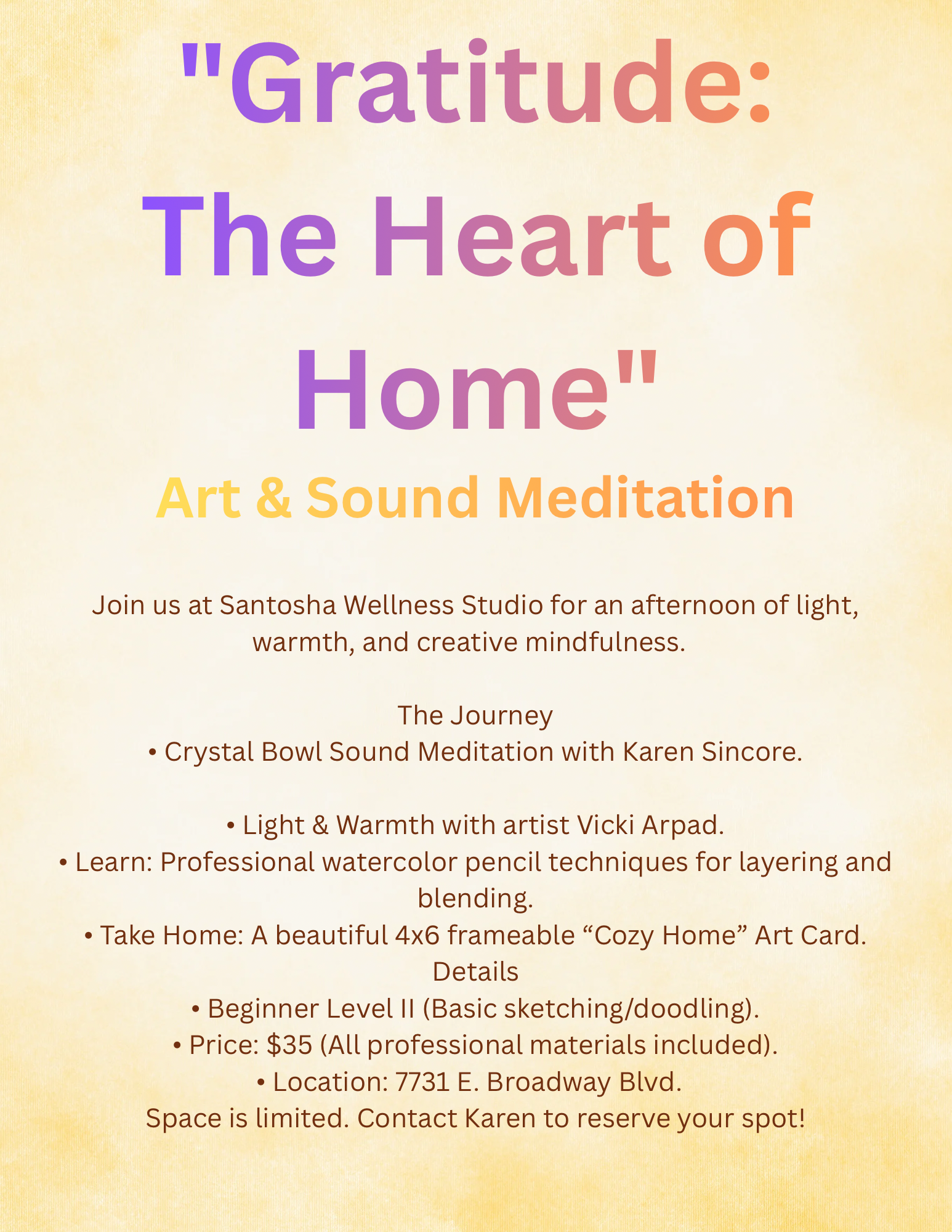 Santosha Wellness Yoga offers a wide variety of workshops and events designed to promote physical, mental, and spiritual well-being. Our offerings include yoga and mindfulness classes for all levels, transformative Reiki healing, and private wellness sessions. Connect with nature through outdoor adventures and immersive nature-based activities that rejuvenate your mind and body. Whether you’re new to yoga or looking to deepen your practice, Santosha Wellness Yoga provides tools to support your holistic wellness journey. Join us to explore balance, self-care, and mindful living in a supportive and welcoming environment.